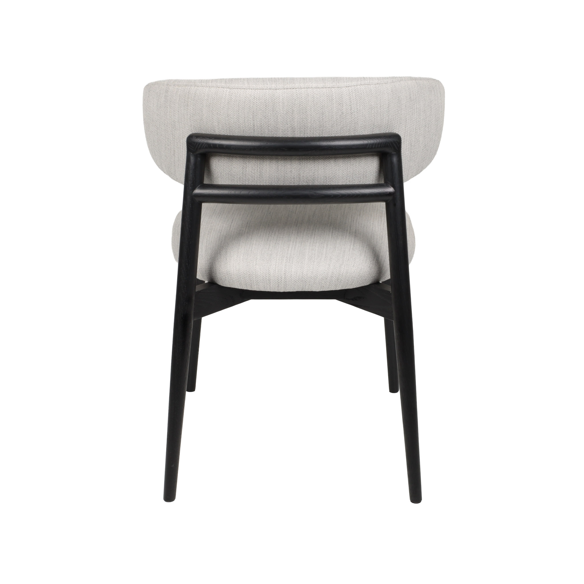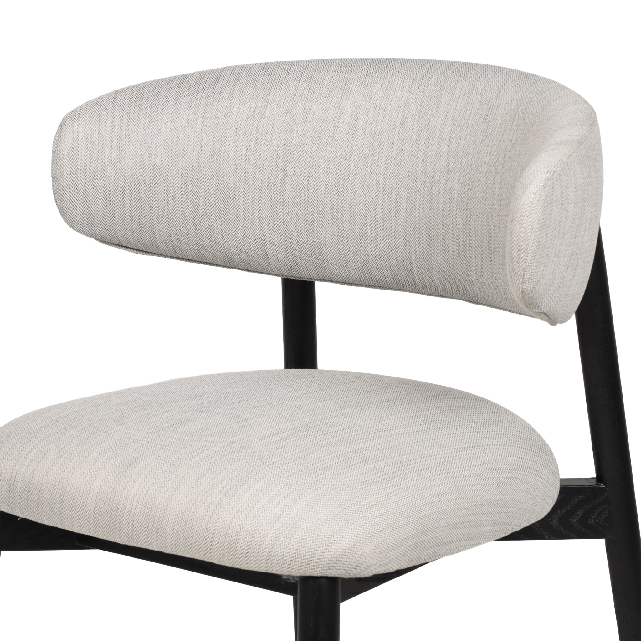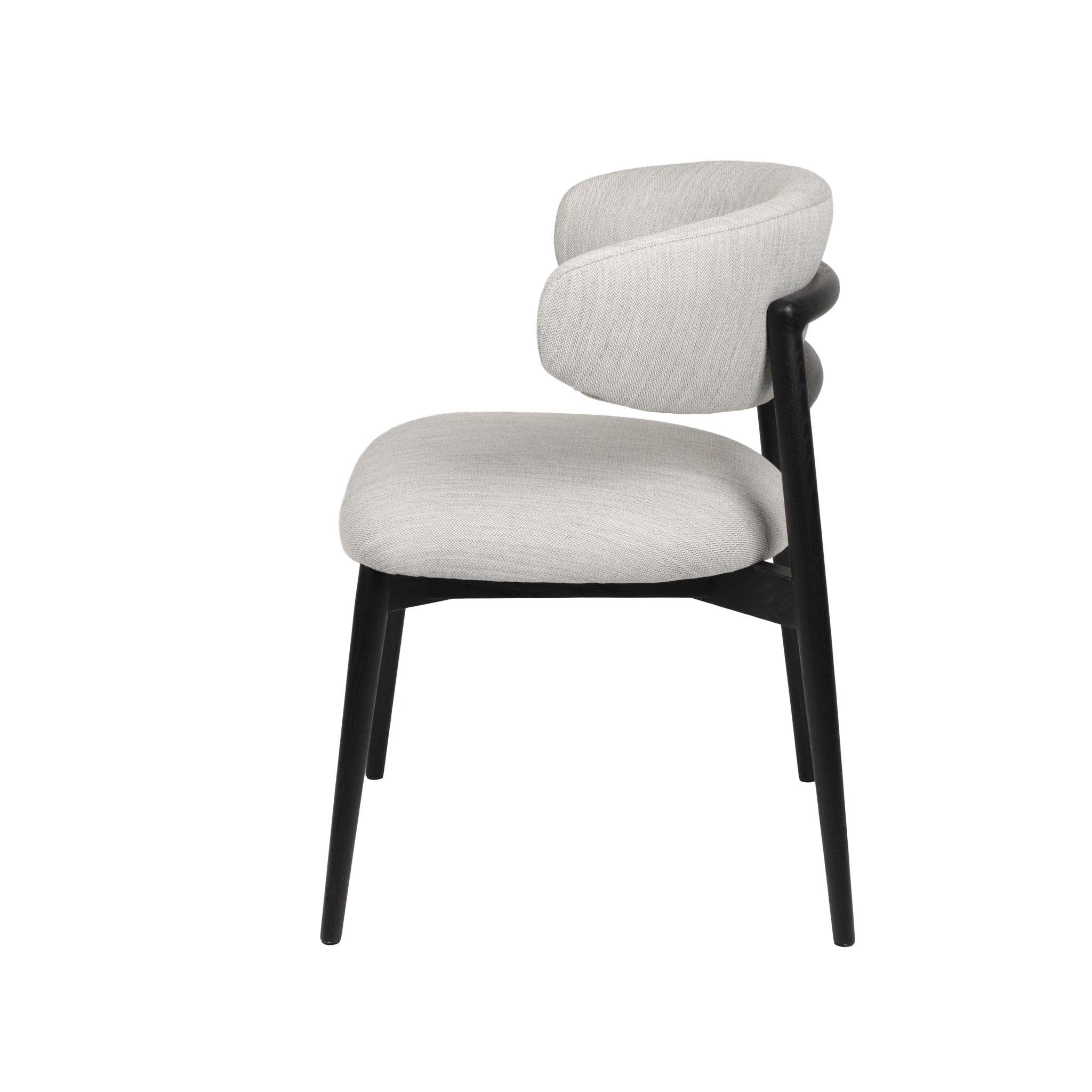 Silla de comedor con asiento y respaldo de tela en color gris claro, y patas de madera en color negro.