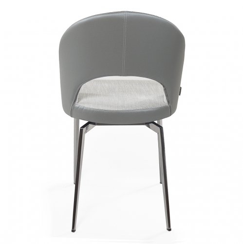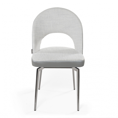 Silla de comedor giratoria con asiento de tela en color gris claro, con detalle por detrás de cuerina en color plateado, y patas de acero en color gris oscuro.