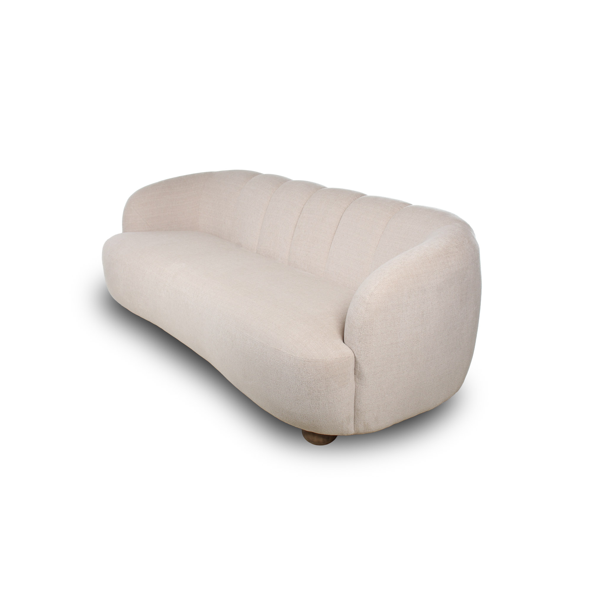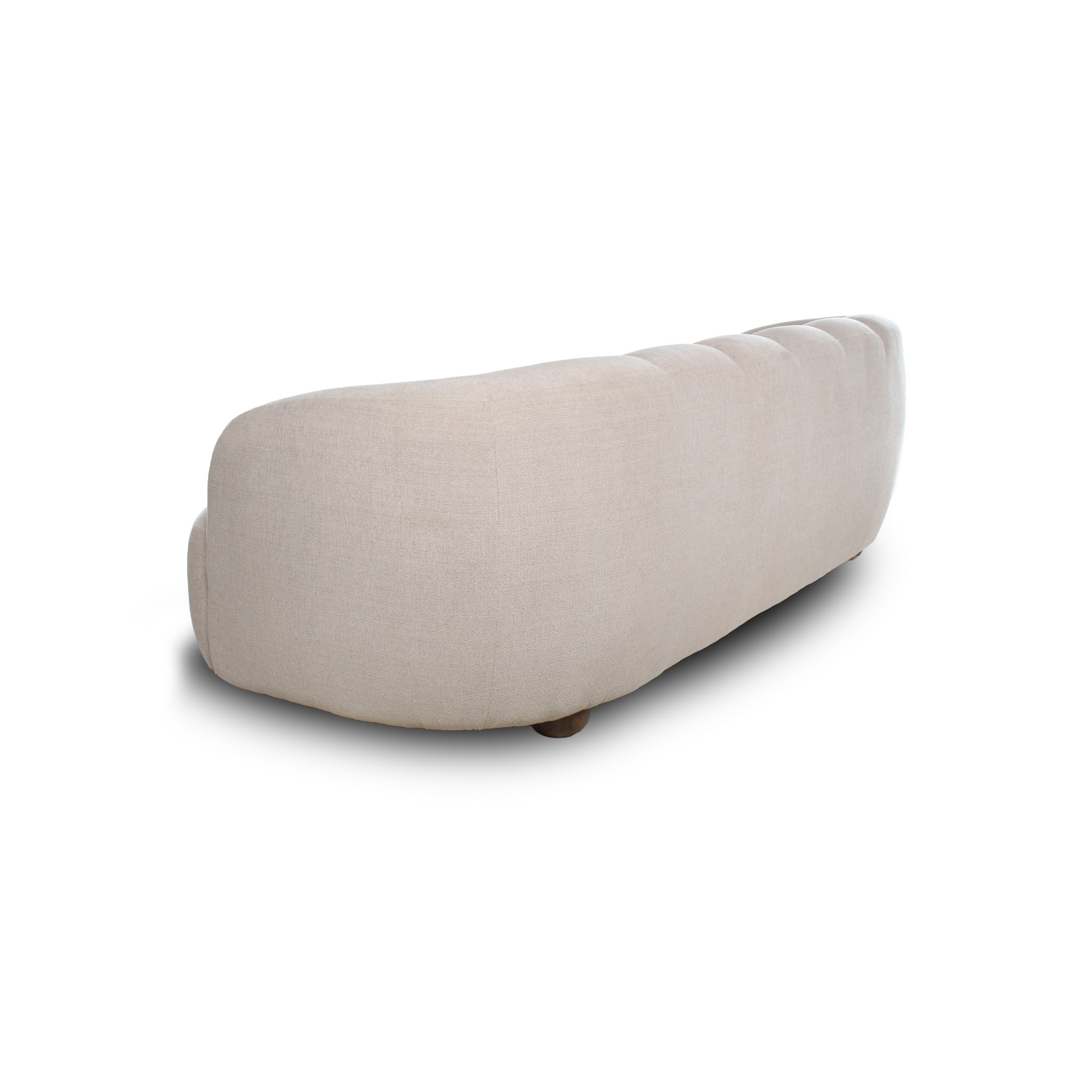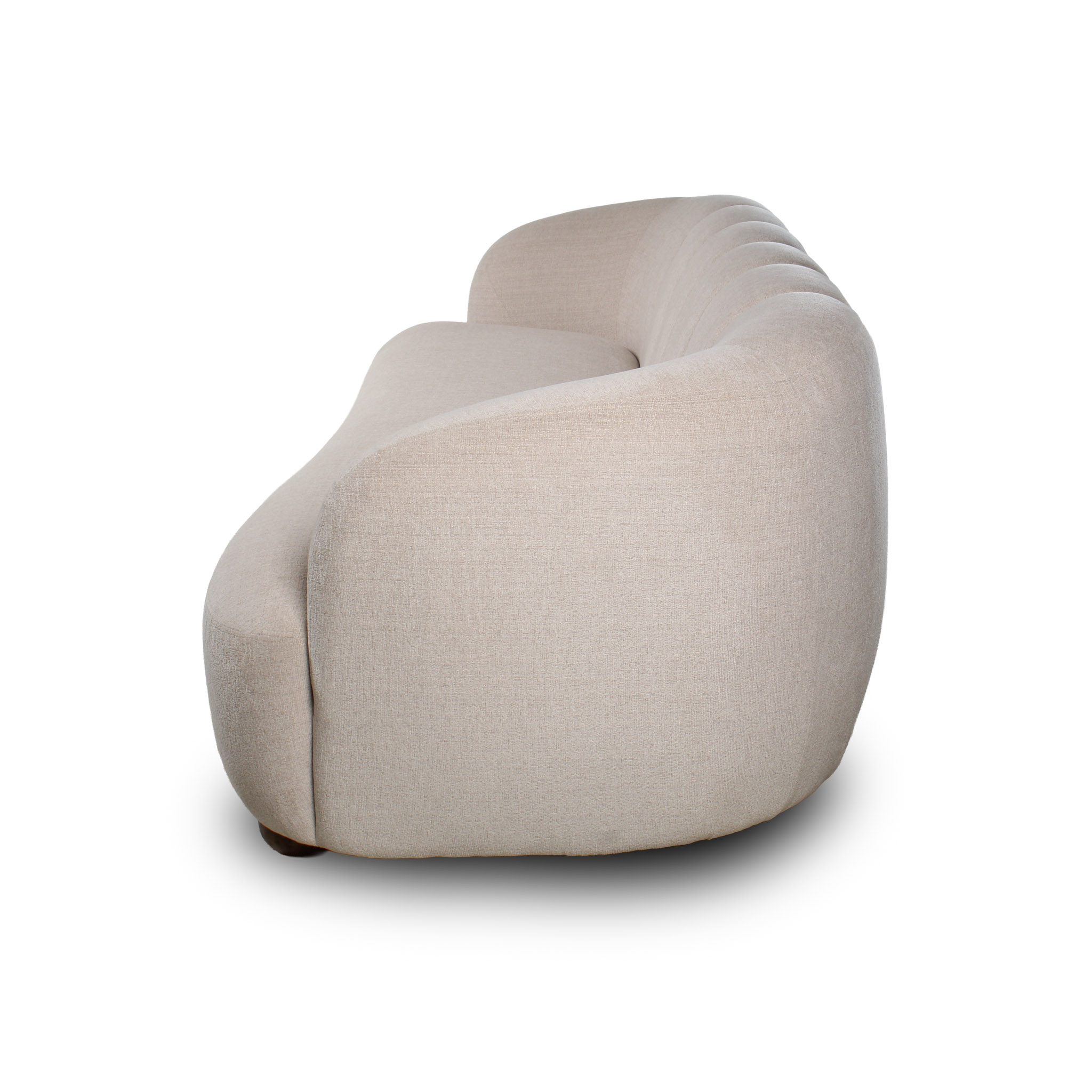 El sofá de cuatro puestos en tela crema destaca por su diseño curvo y elegante. Su tapizado suave aporta luminosidad y calidez, creando un ambiente acogedor y sofisticado. Una pieza versátil y contemporánea, ideal para realzar salas modernas con estilo.