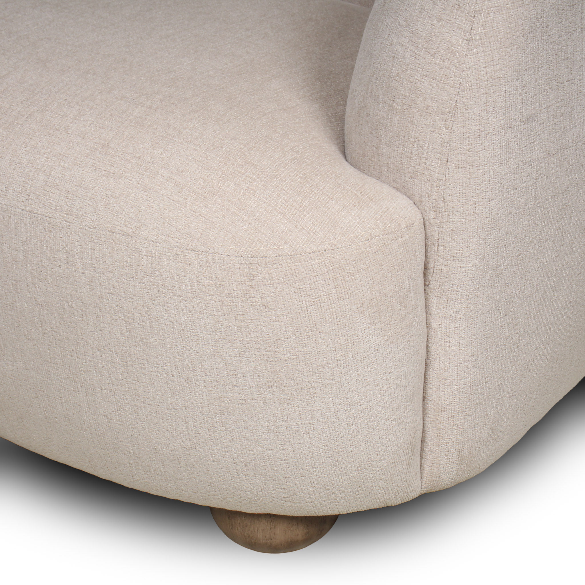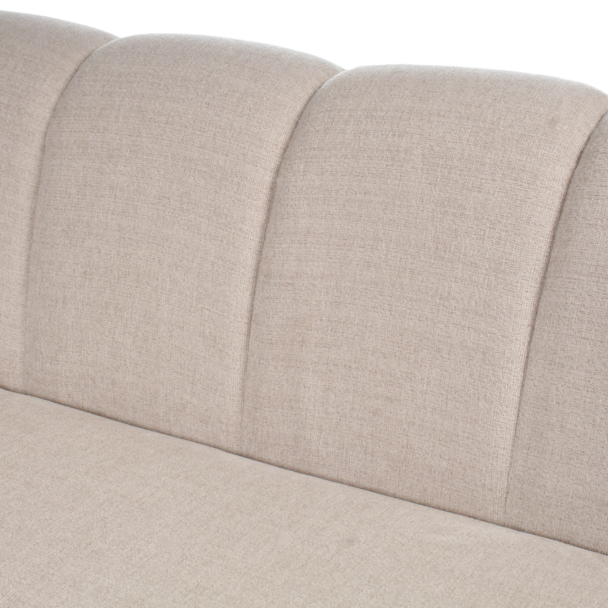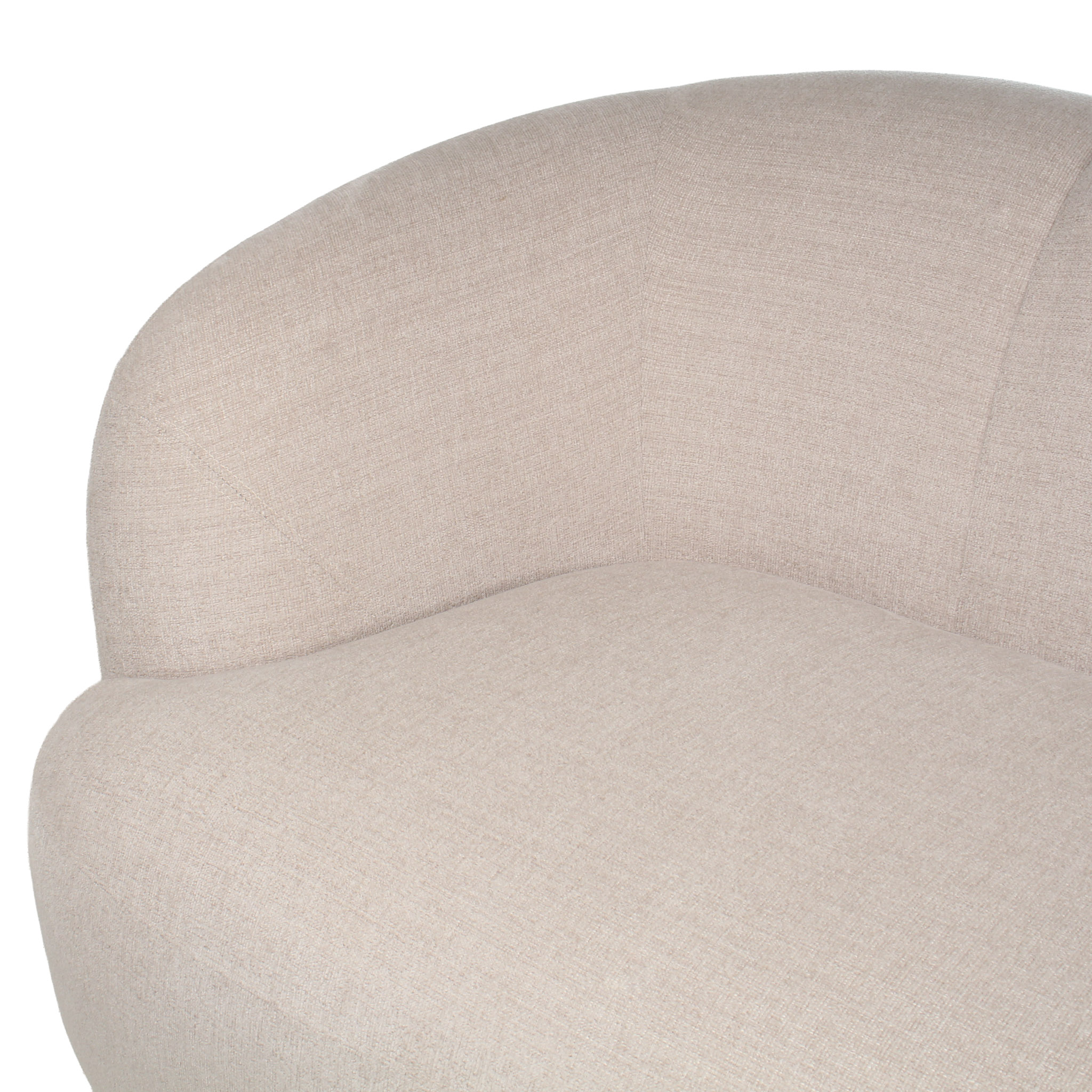 El sofá de cuatro puestos en tela crema destaca por su diseño curvo y elegante. Su tapizado suave aporta luminosidad y calidez, creando un ambiente acogedor y sofisticado. Una pieza versátil y contemporánea, ideal para realzar salas modernas con estilo.