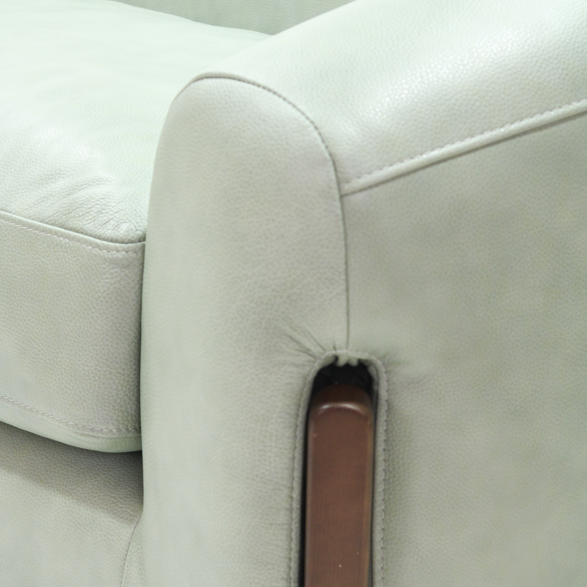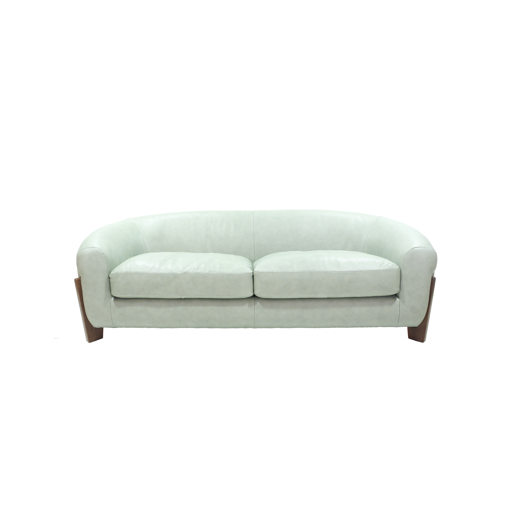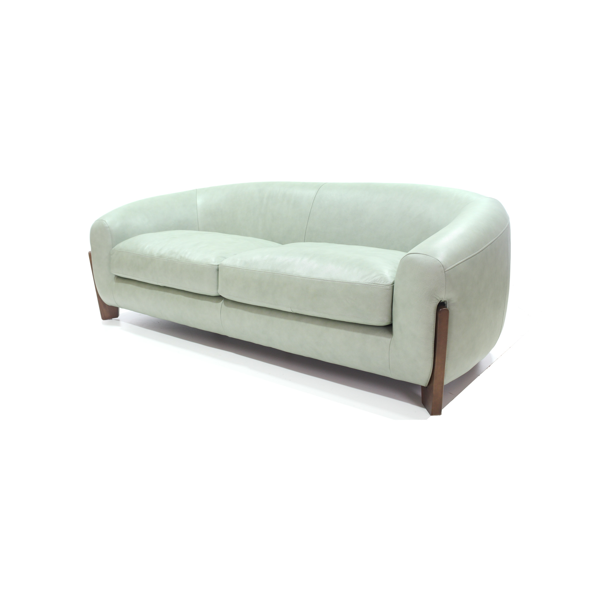 Sofá de tres puestos tapizado en lujoso cuero verde, con elegantes patas de madera oscura. Este sofá ofrece una combinación perfecta de estilo y comodidad, ideal para cualquier sala de estar. Su diseño sofisticado y duradero añade un toque de distinción y calidez a tu hogar.