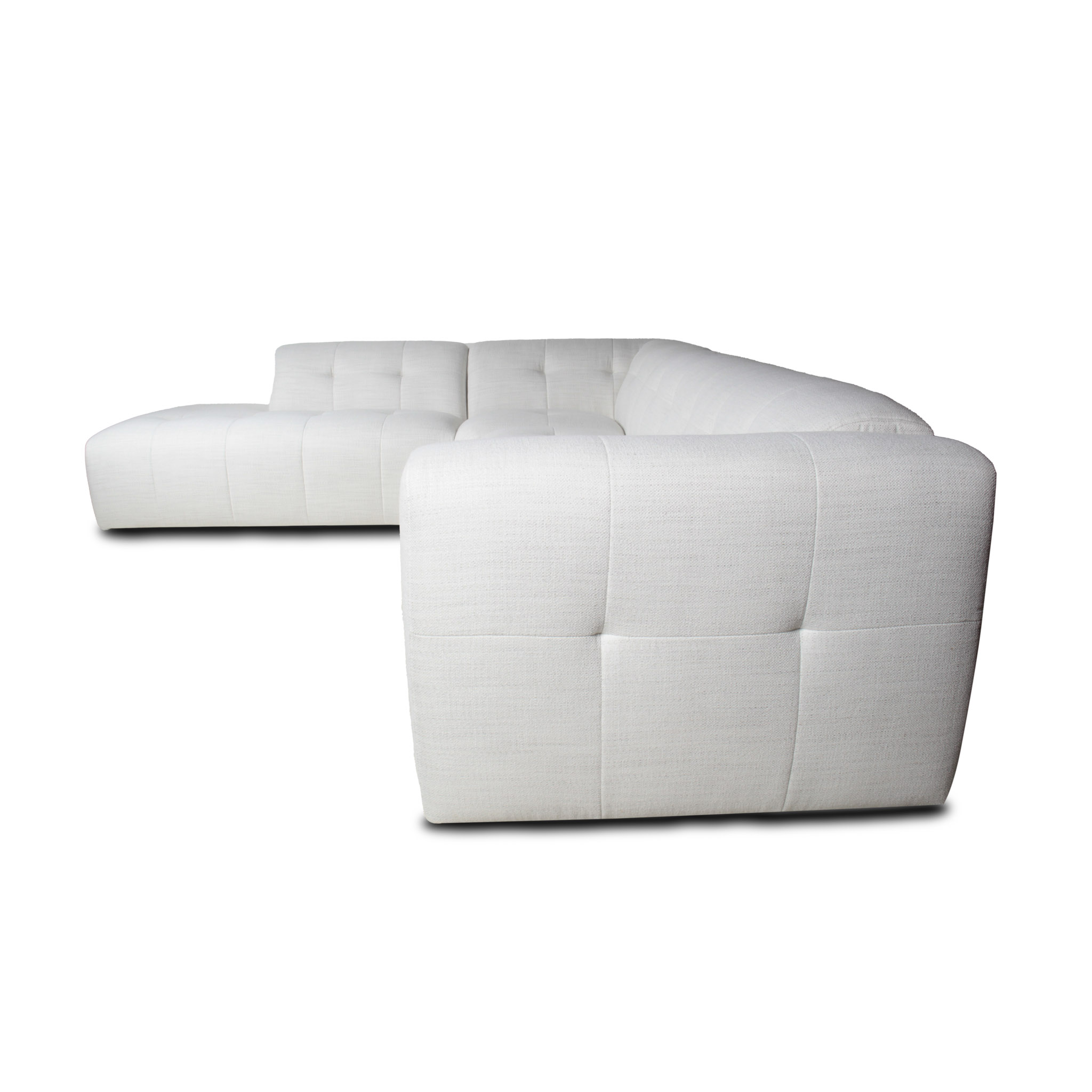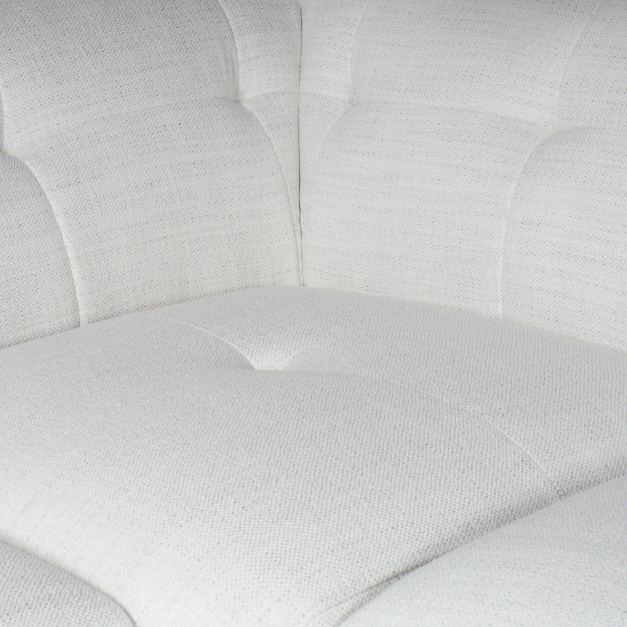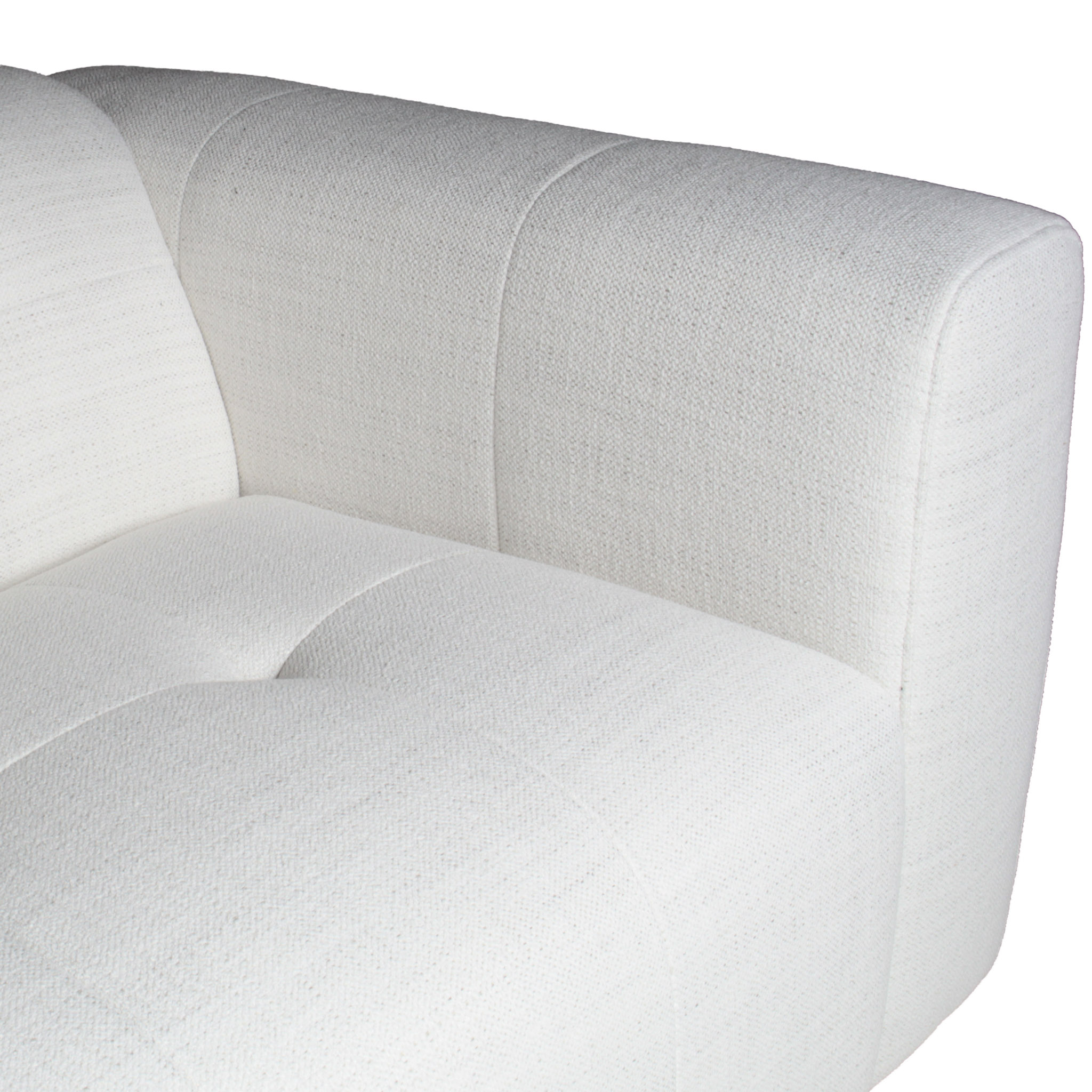 El sofá seccional en tela blanca con chaise izquierdo destaca por su limpieza visual y estilo versátil. Ideal para quienes buscan una atmósfera fresca, amplia y serena, es una excelente opción para espacios donde la luz y el diseño son protagonistas.