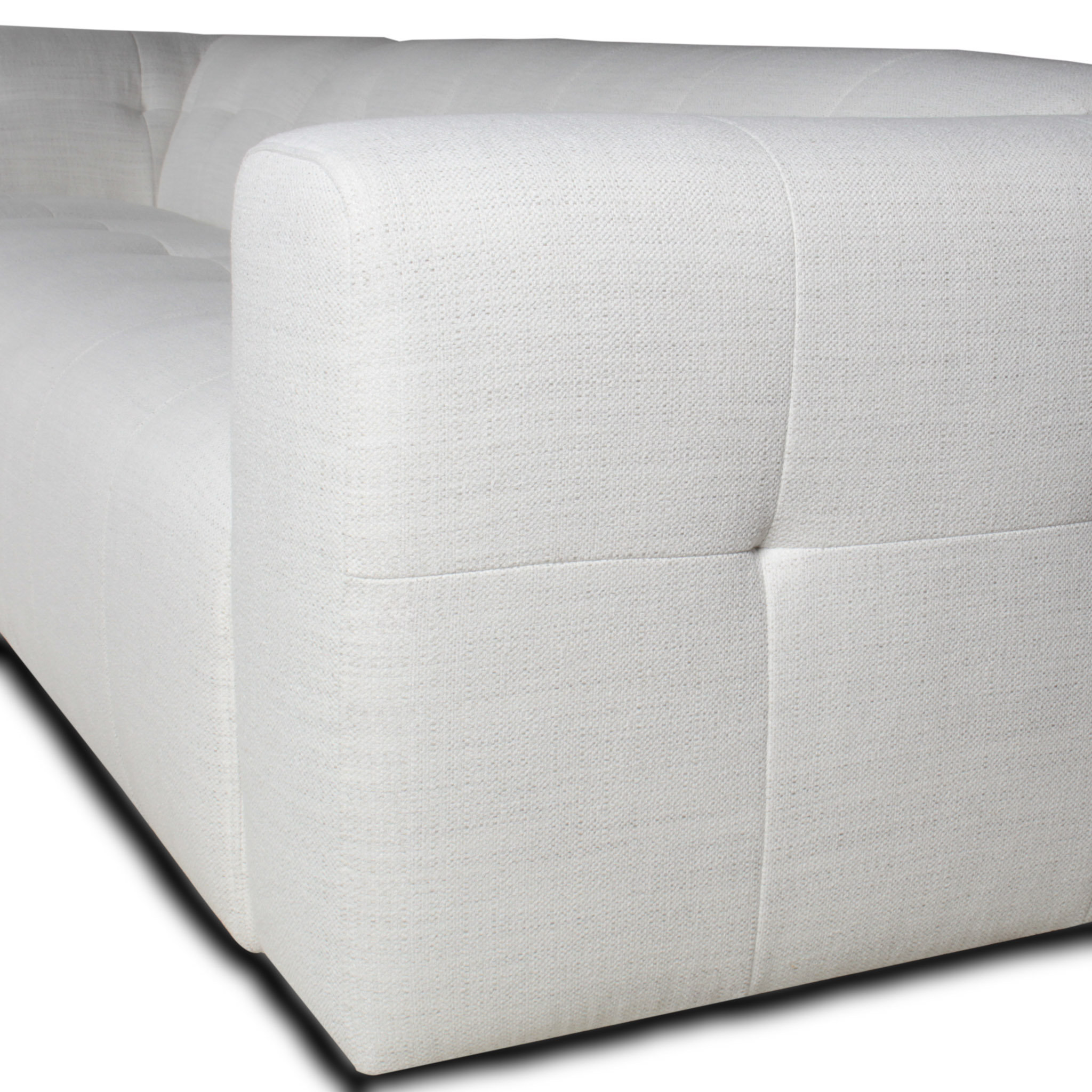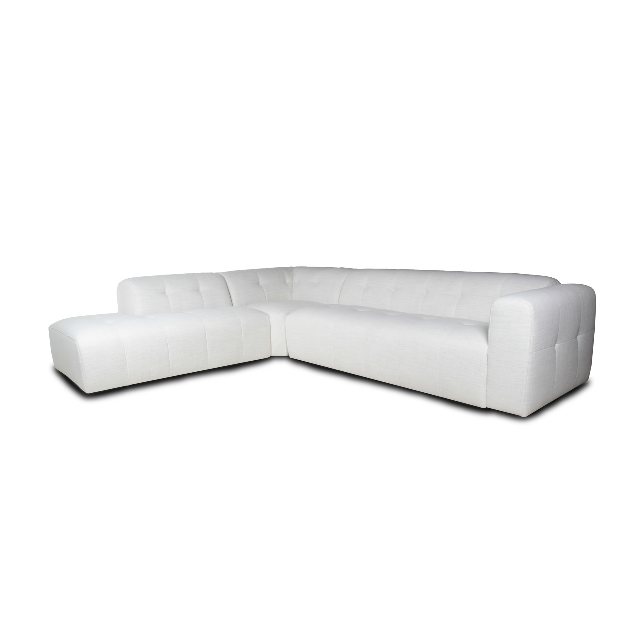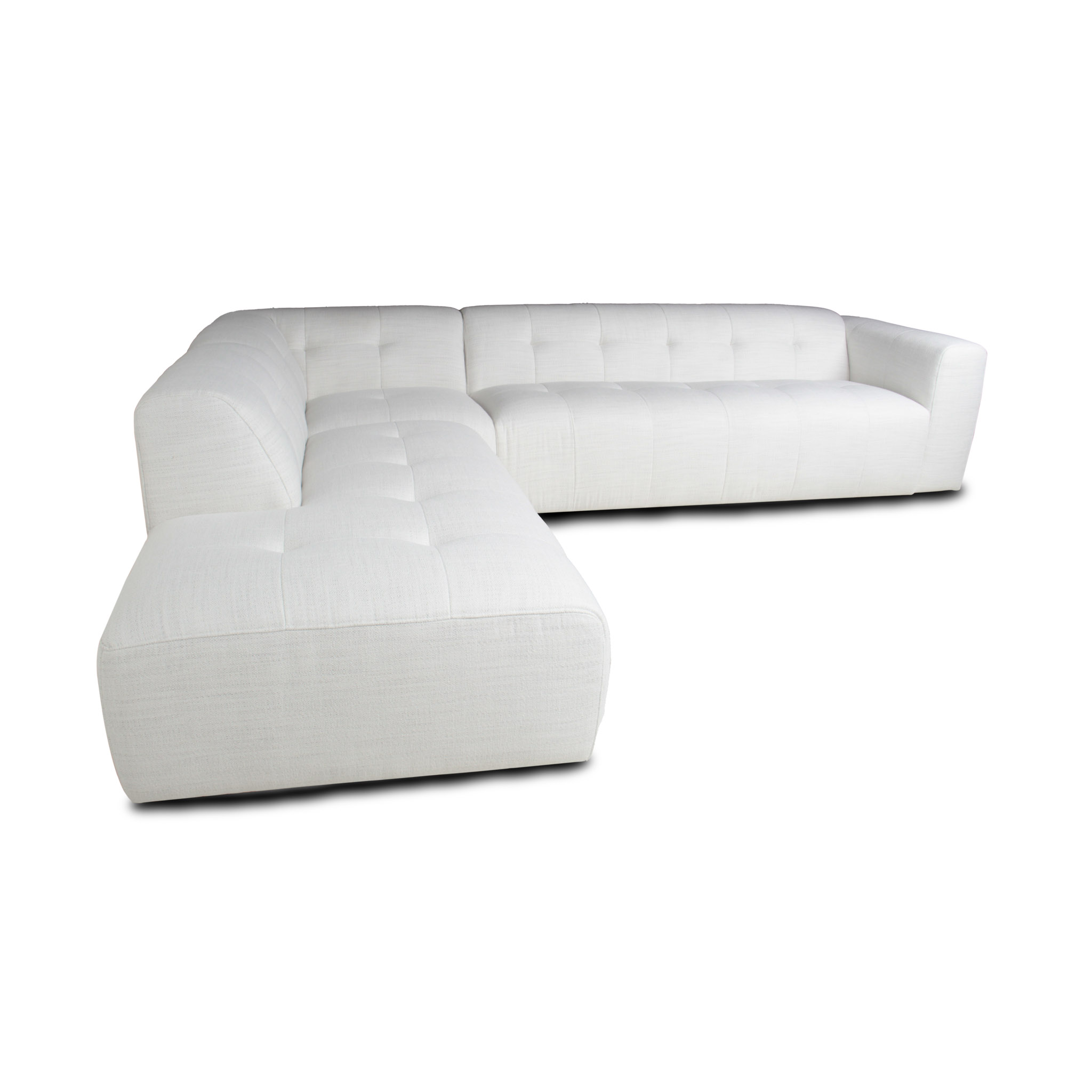 El sofá seccional en tela blanca con chaise izquierdo destaca por su limpieza visual y estilo versátil. Ideal para quienes buscan una atmósfera fresca, amplia y serena, es una excelente opción para espacios donde la luz y el diseño son protagonistas.