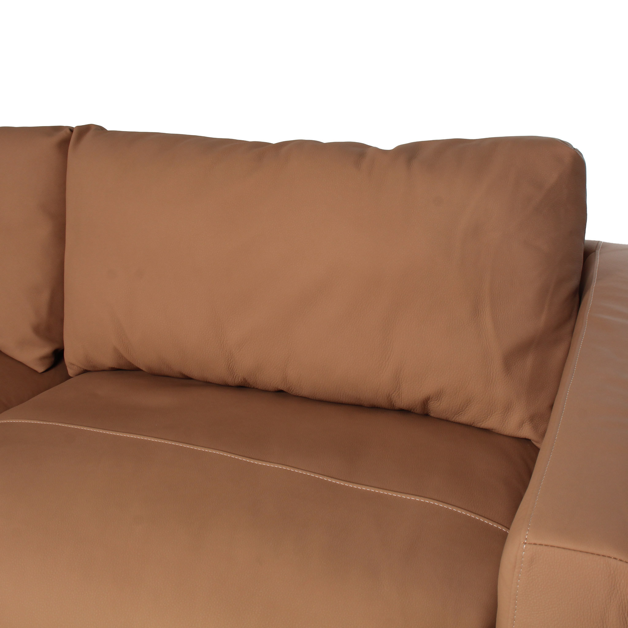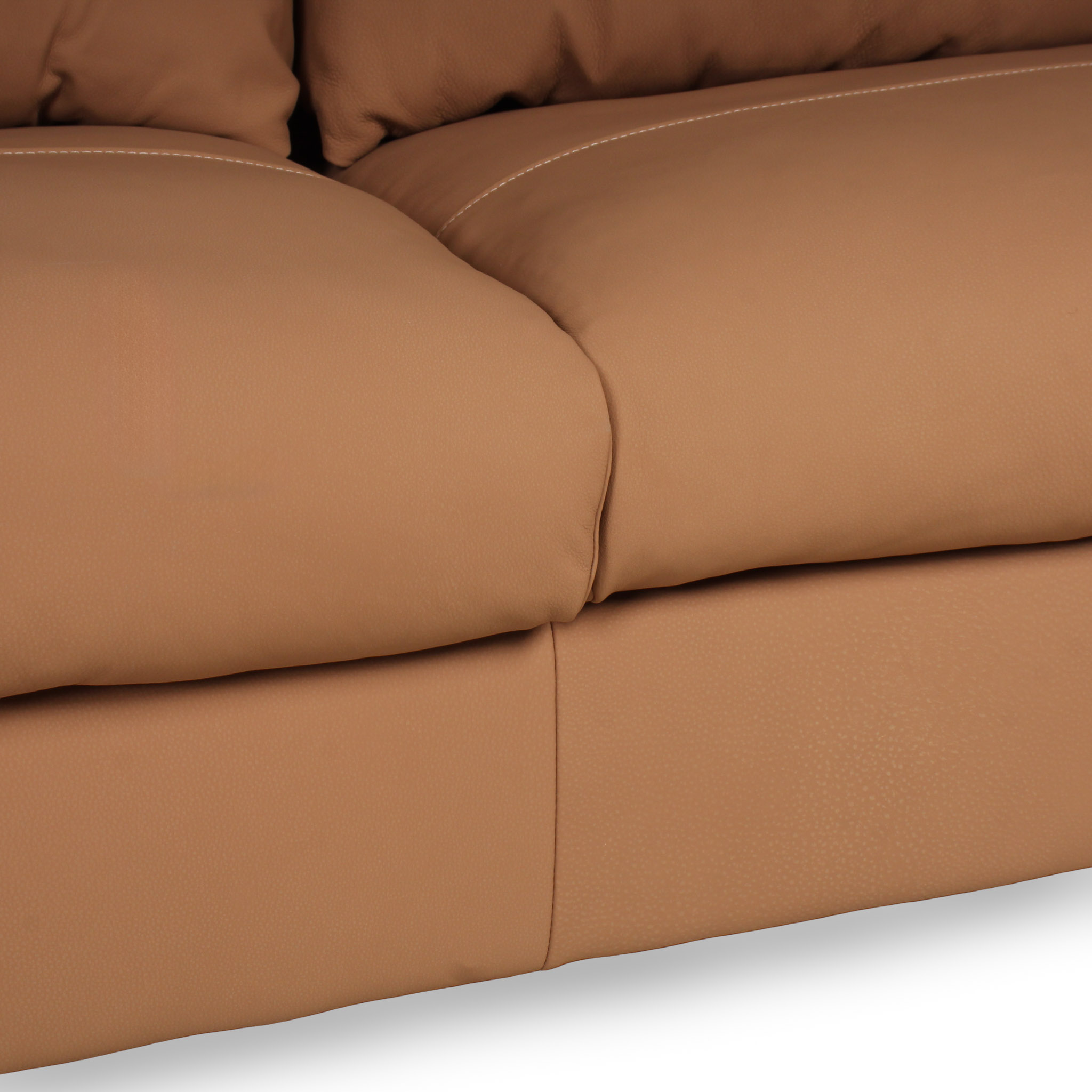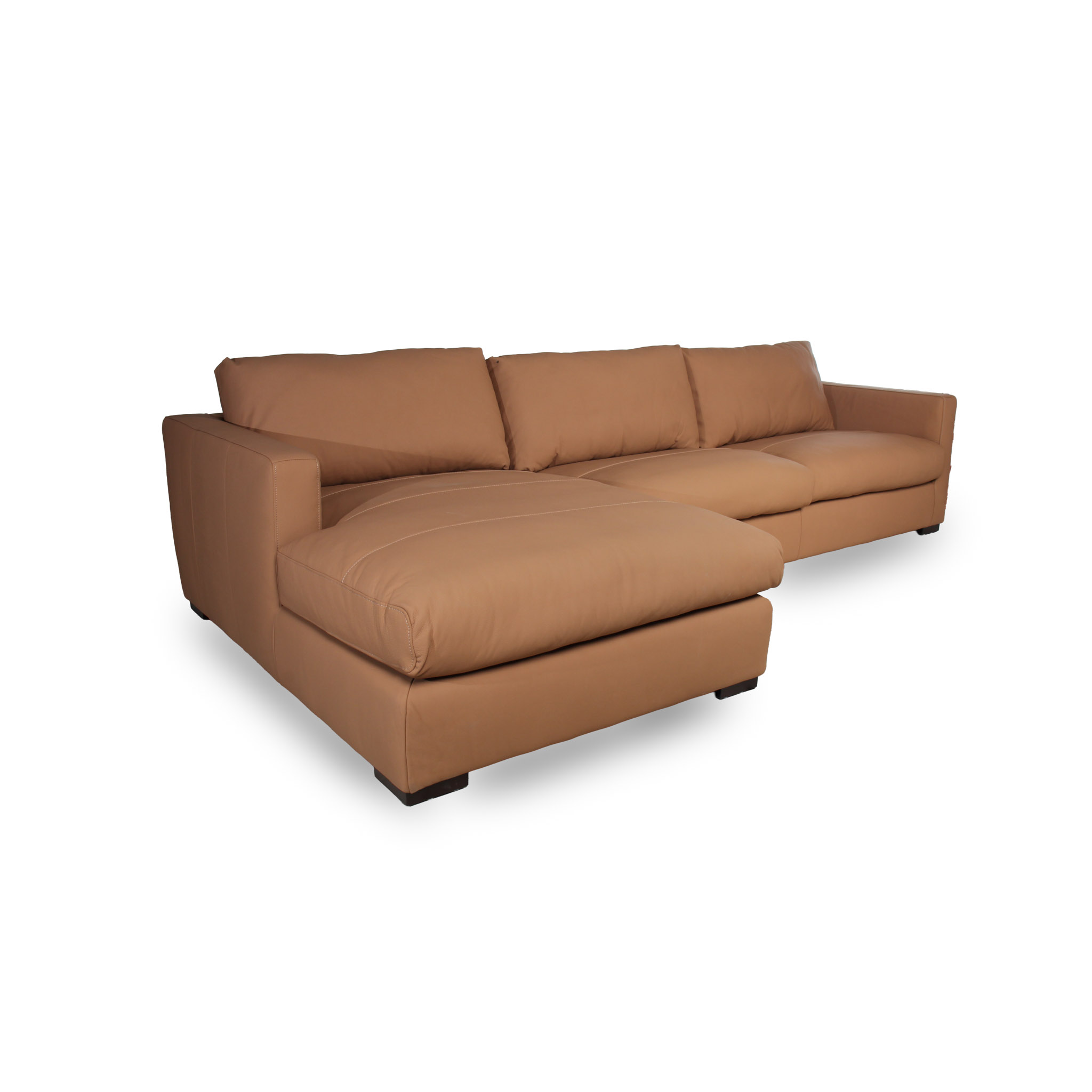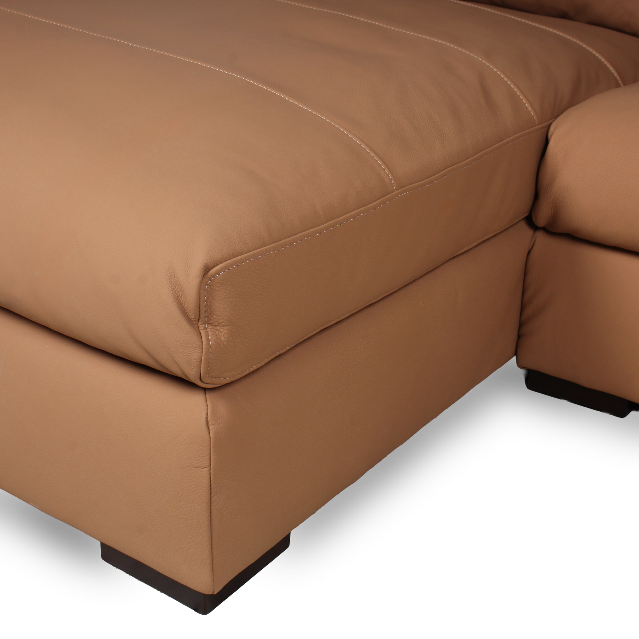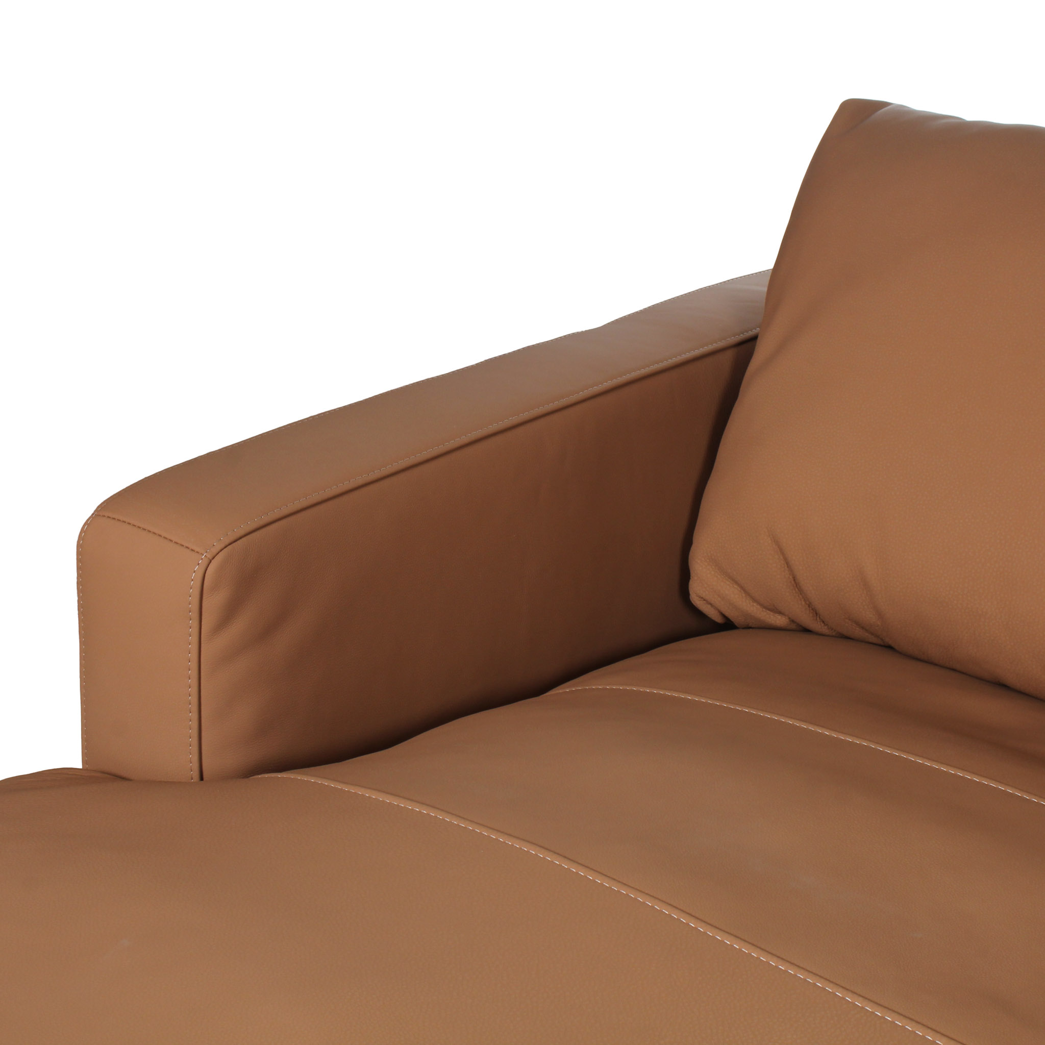 Sofá seccional de cuero camel con sofá derecho y chaise izquierdo. Un diseño elegante y espacioso que ofrece comodidad y estilo, perfecto para crear un ambiente moderno y relajante en cualquier sala de estar.