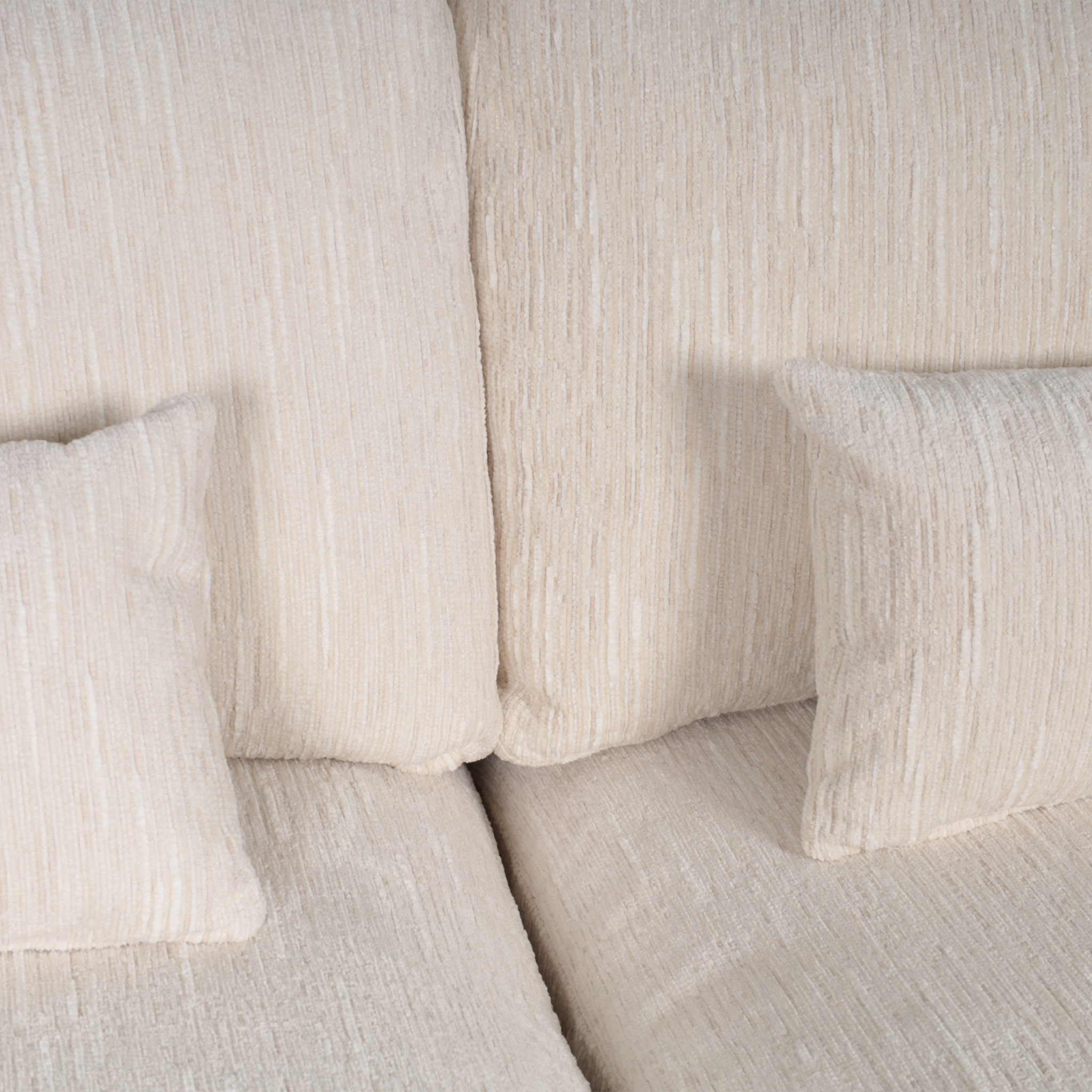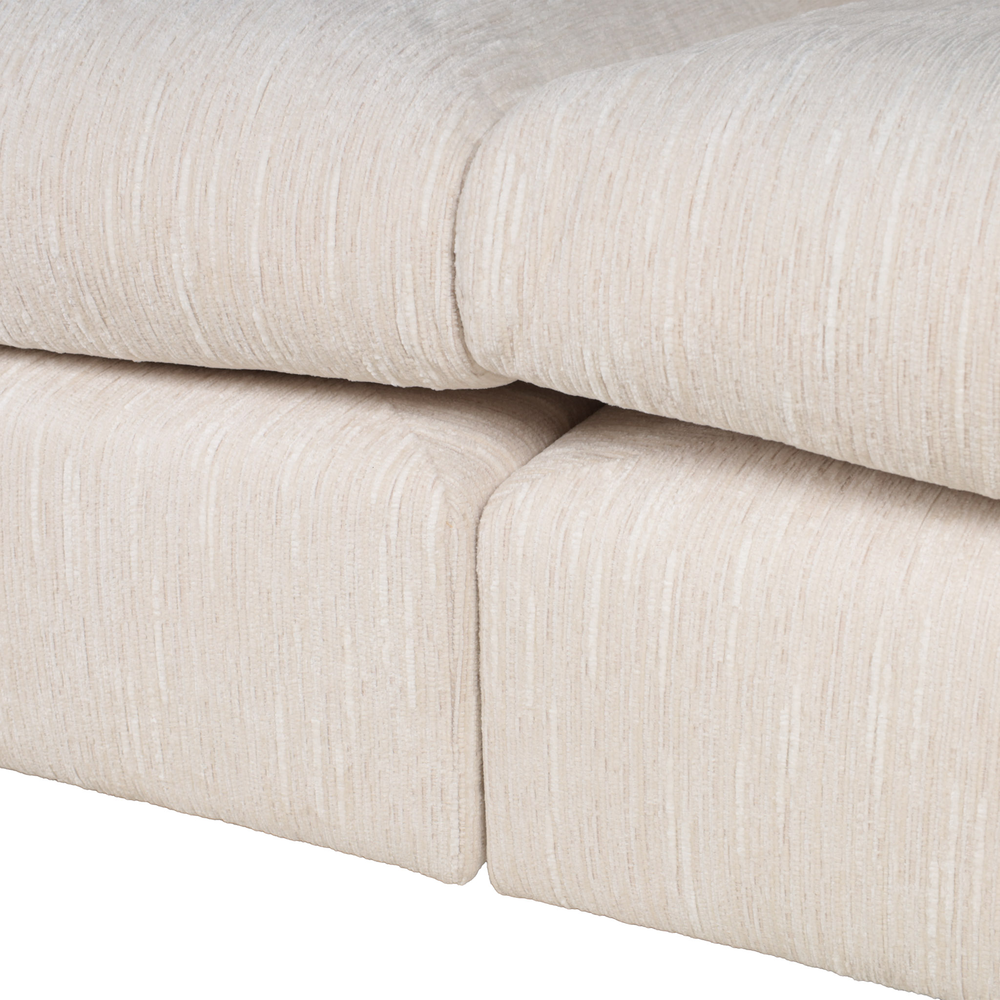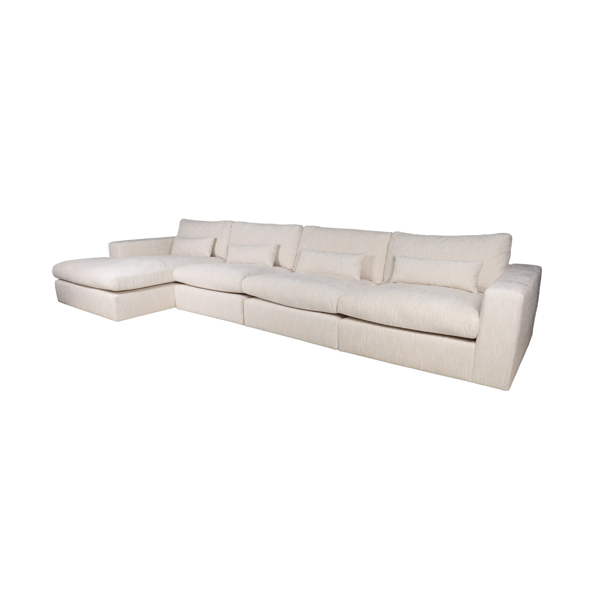 Espacioso sofá seccional de tela en tono ivory con detalles en hilos color blanco, con el chaise del lado izquierdo.