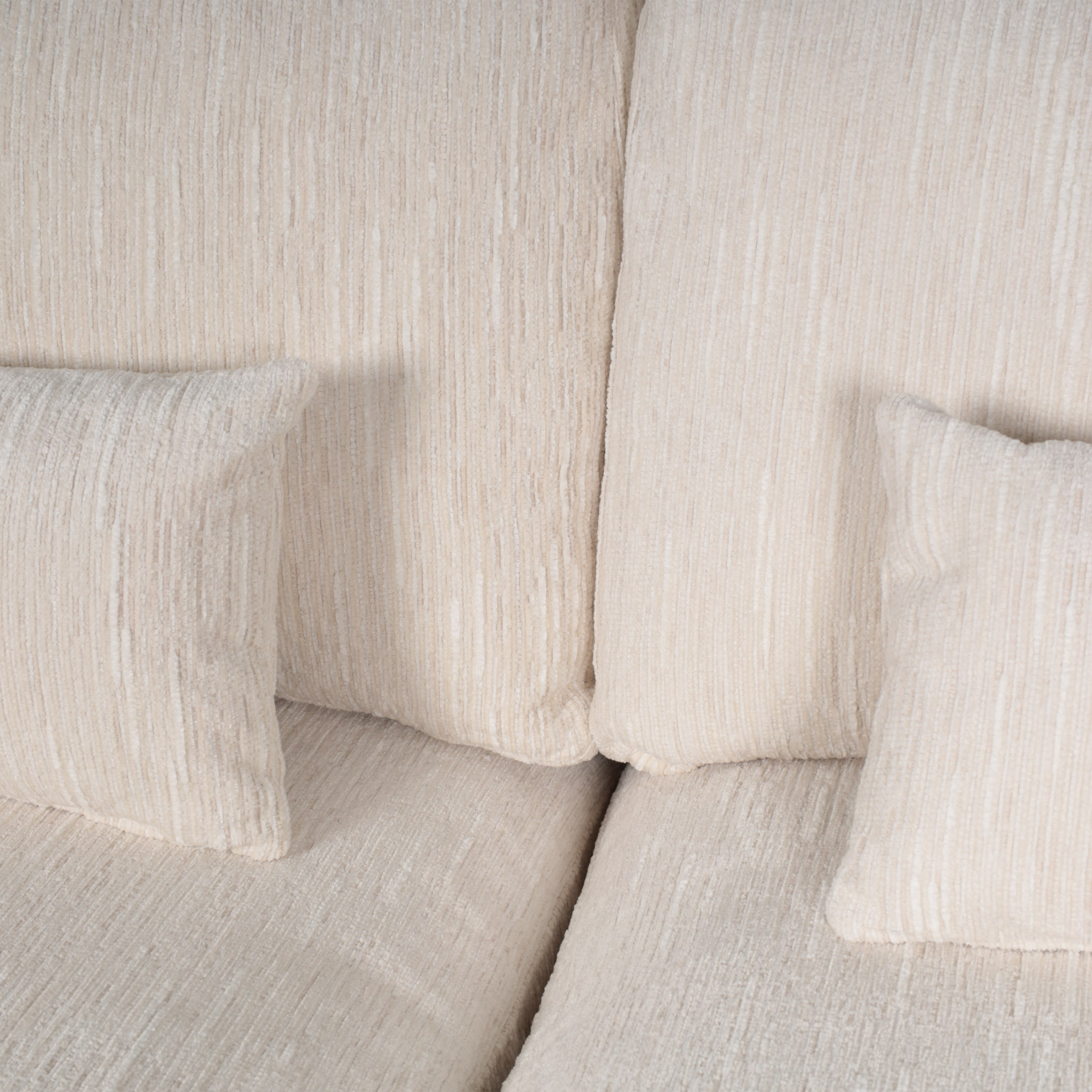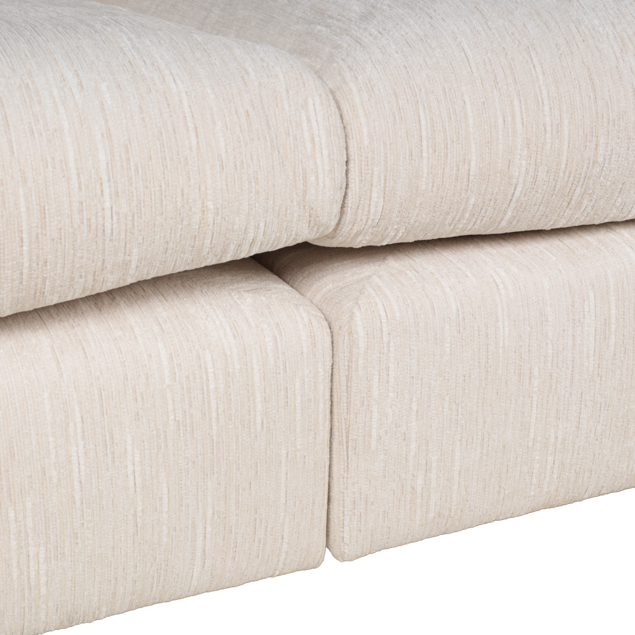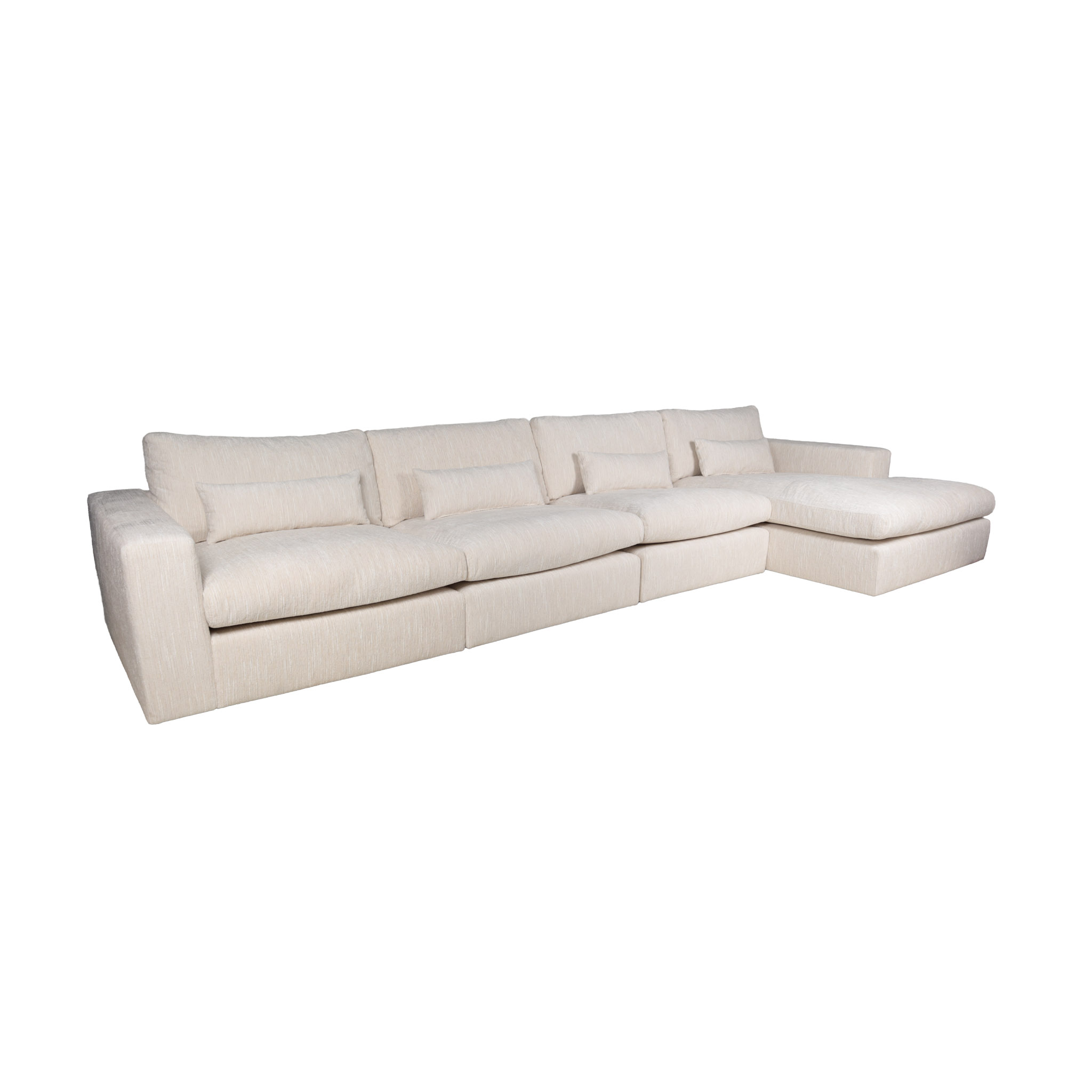 Espacioso sofá seccional de tela en tono ivory con detalles en hilos color blanco, con el chaise del lado derecho.