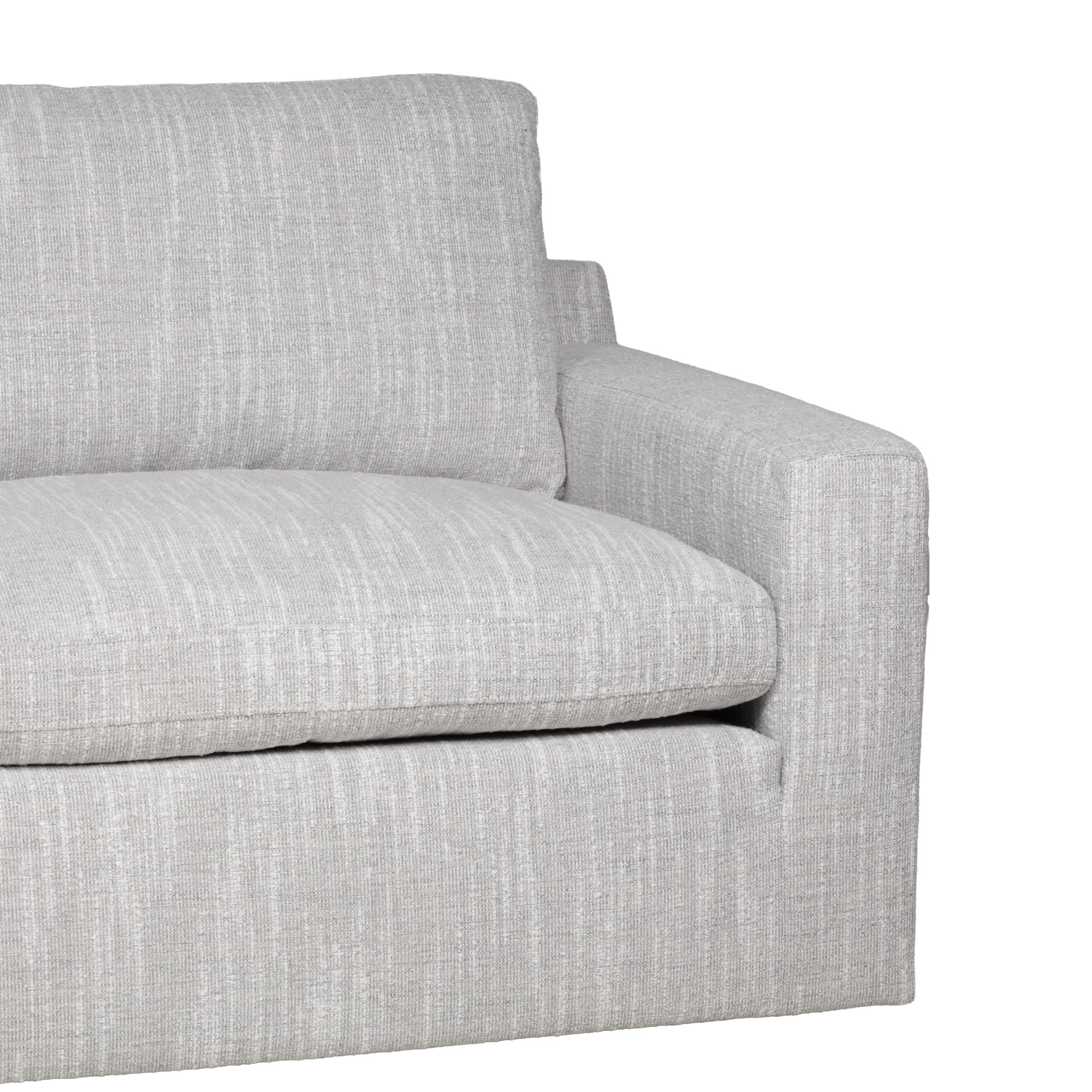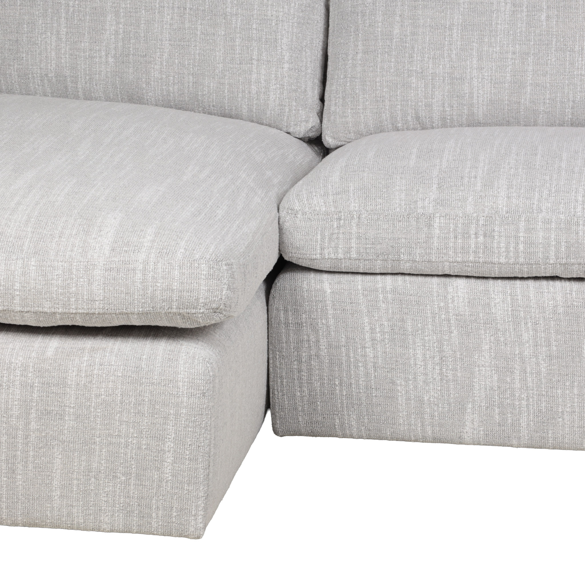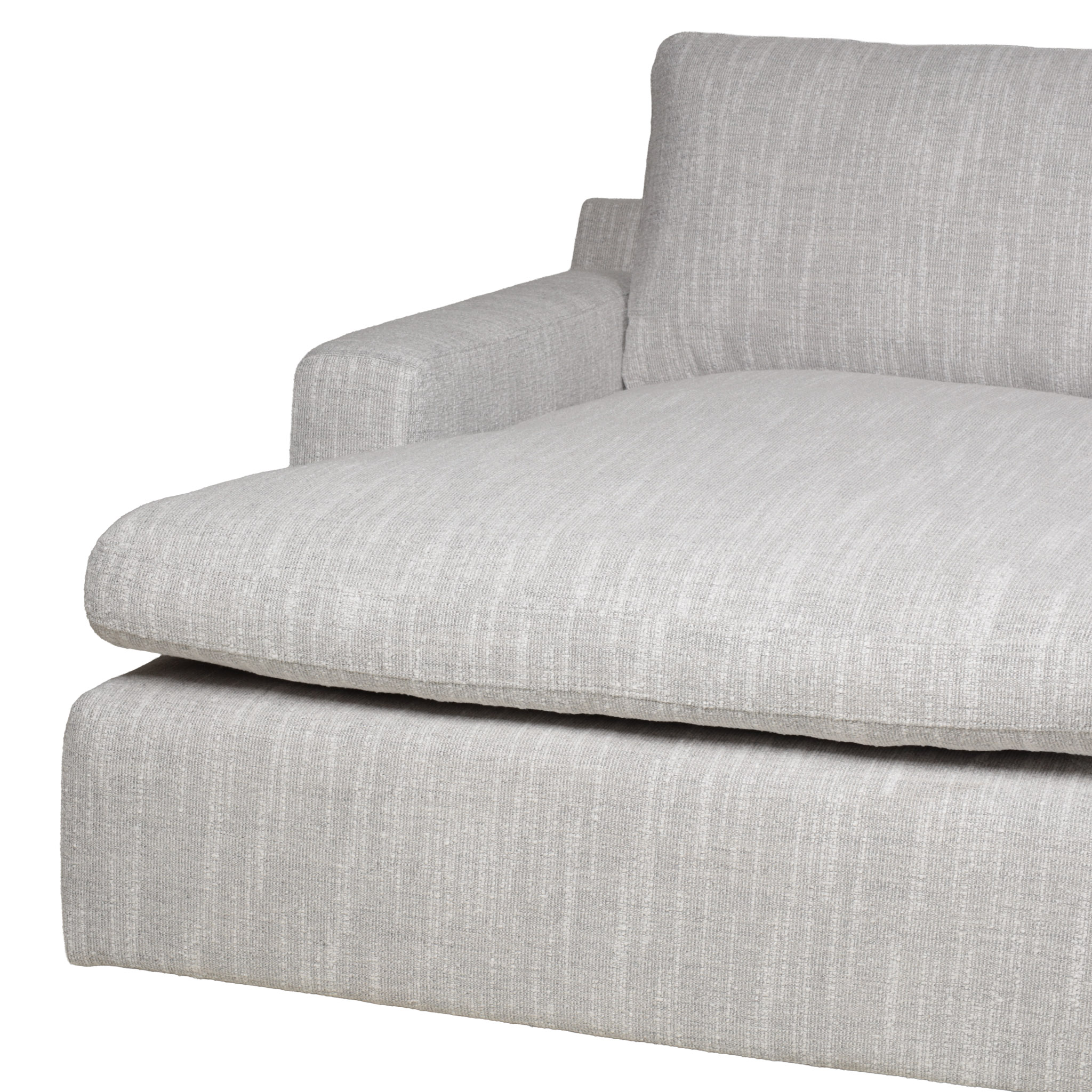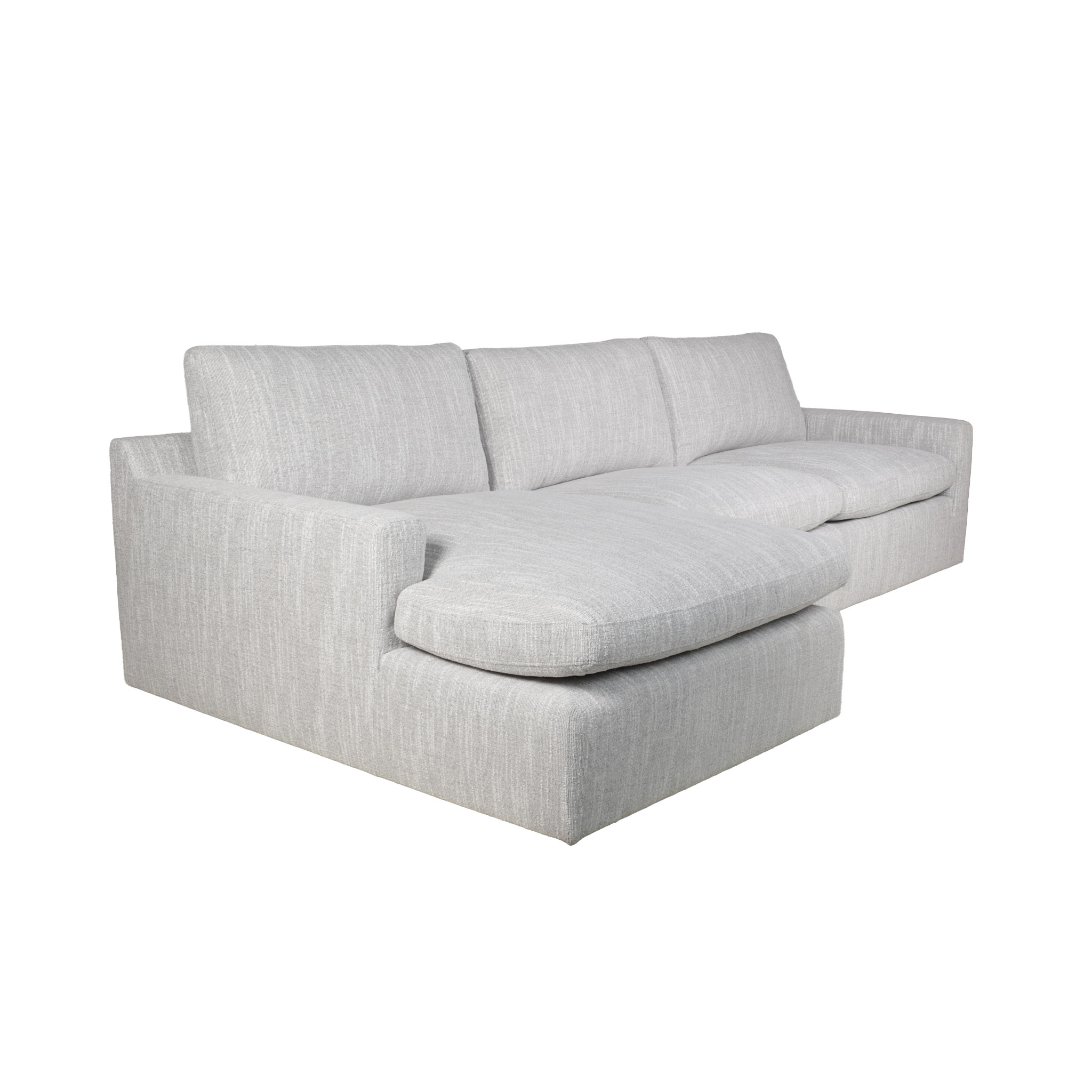 Sofá seccional de tela en tono gris claro con hilos blancos, y chaise del lado izquierdo.