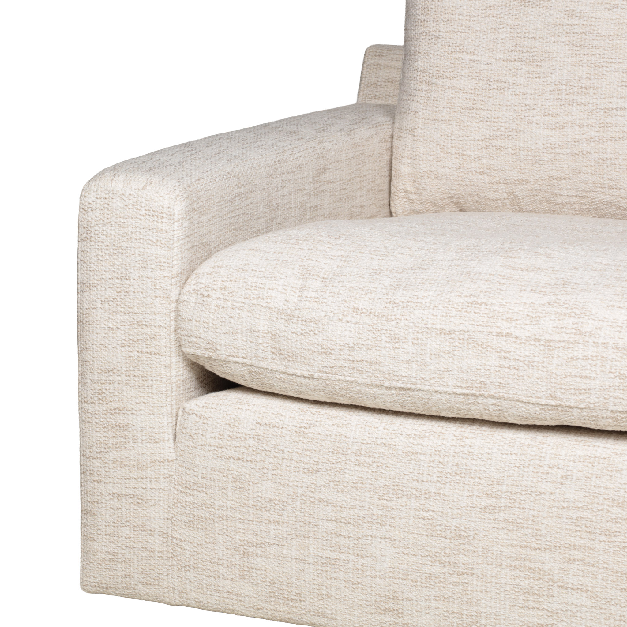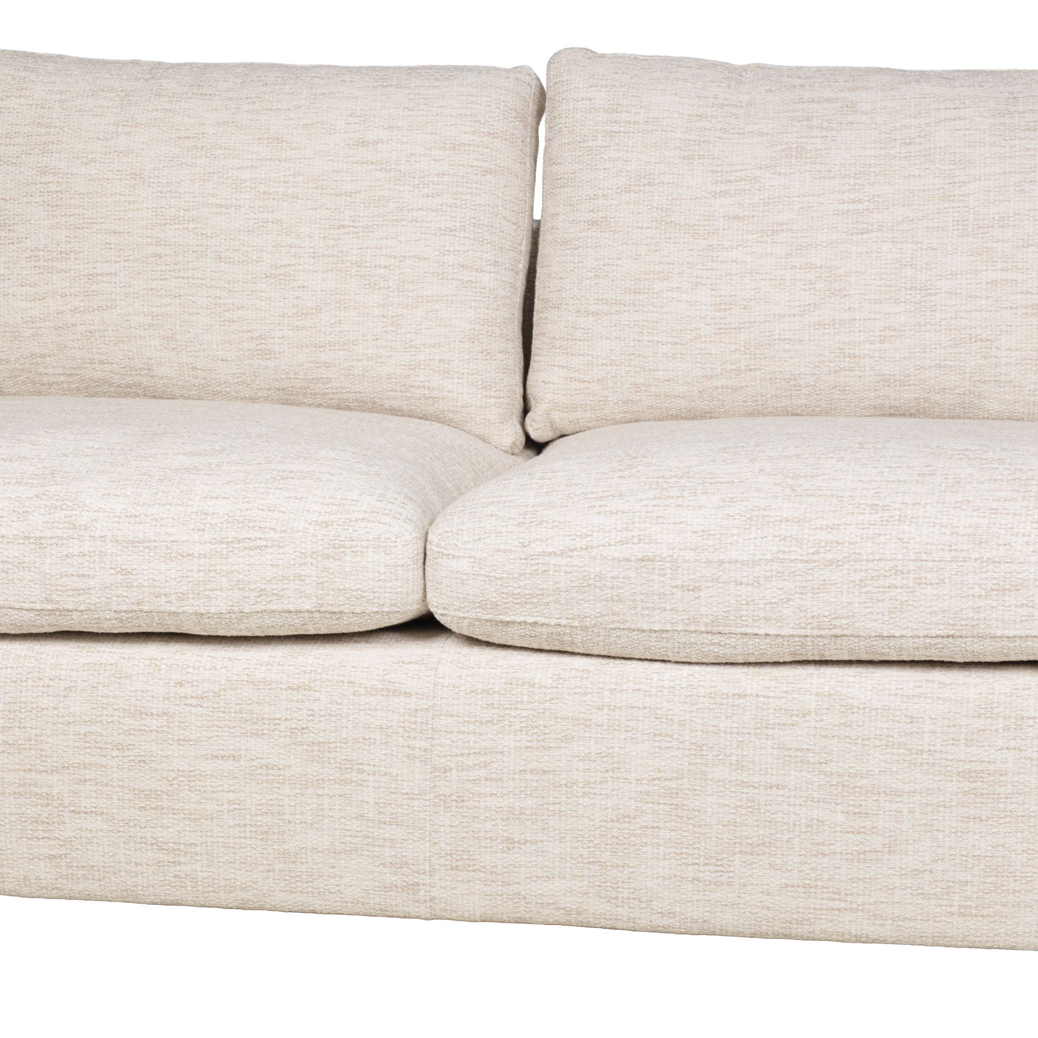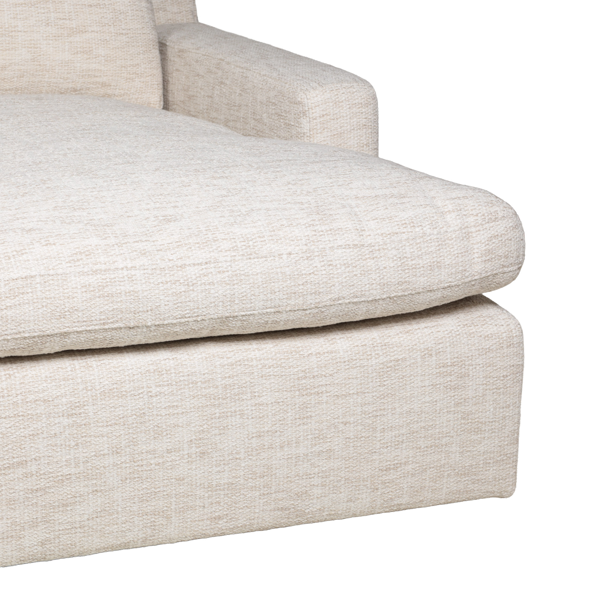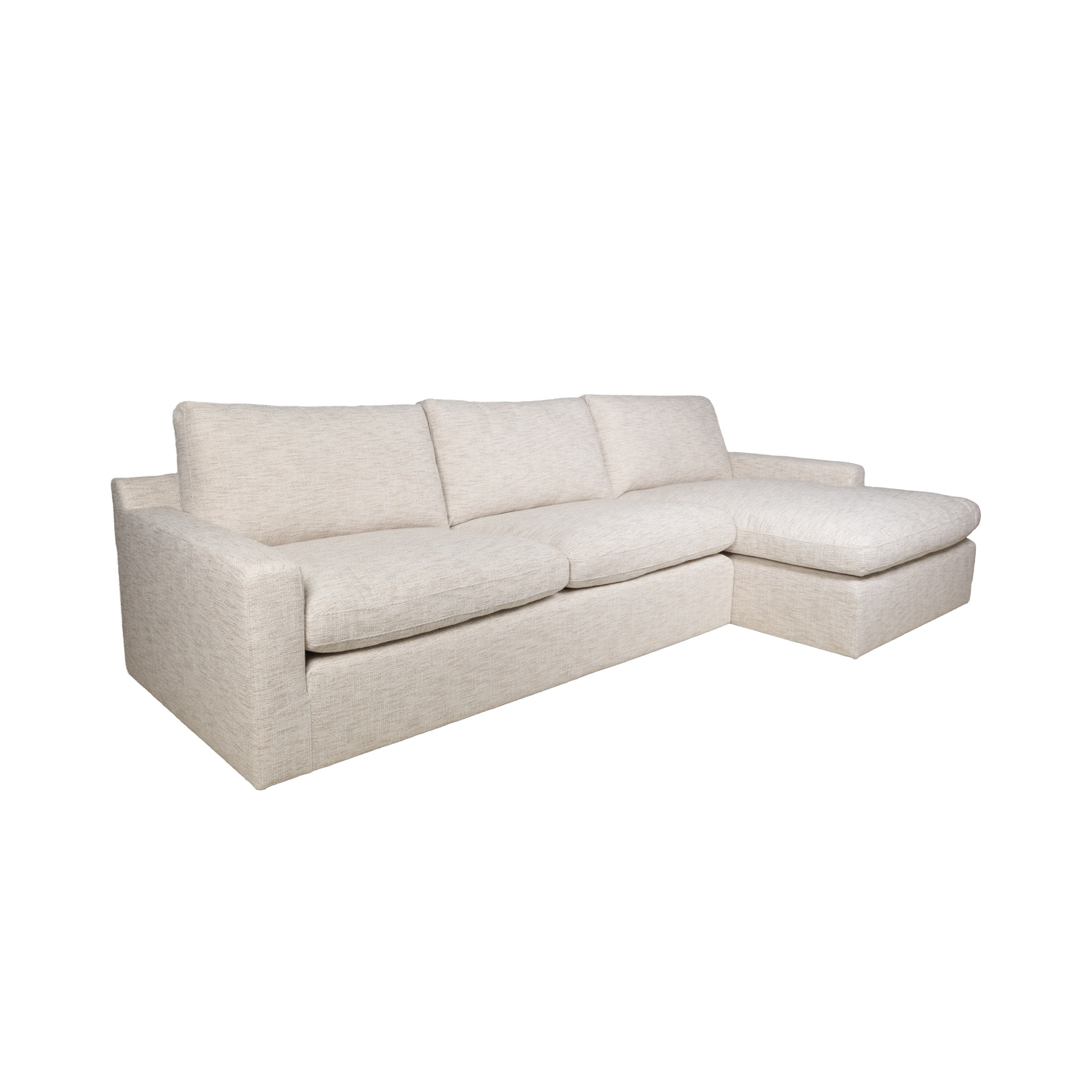 Sofá seccional de tela en tono beige, y chaise del lado derecho.