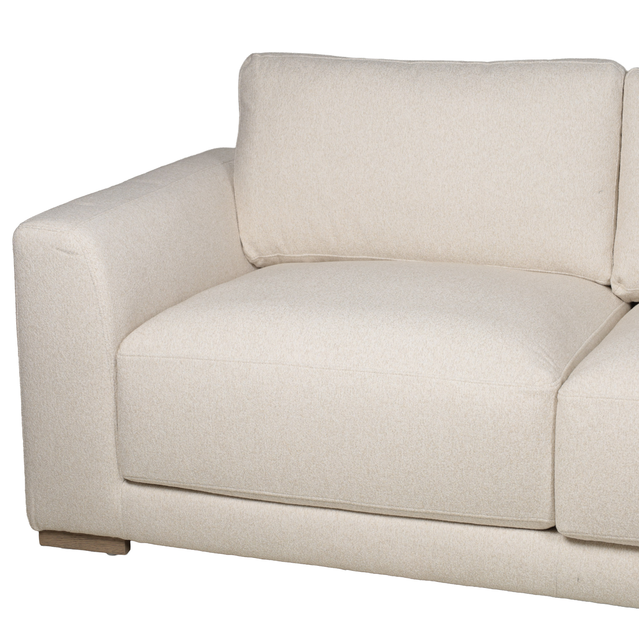 Moderno sofá seccional de tela en tono beige con la curvatura o chaise del lado derecho.